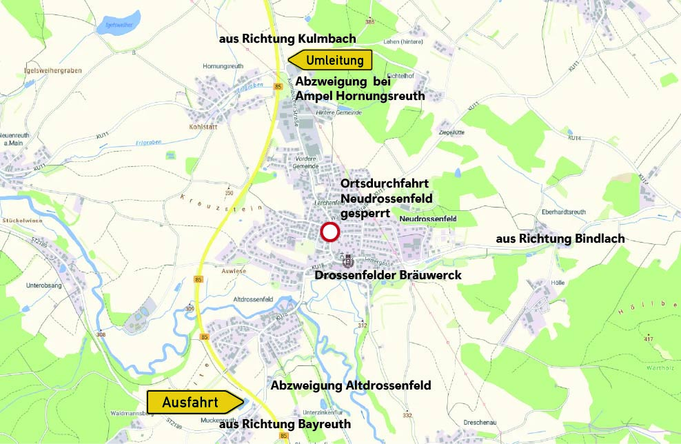Besucher aus Richtung Kulmbach fahren bitte die B85 weiter bis zur Ausfahrt Altdrossenfeld und können von dieser Seite das Bräuwerck in Neudrossenfeld erreichen.